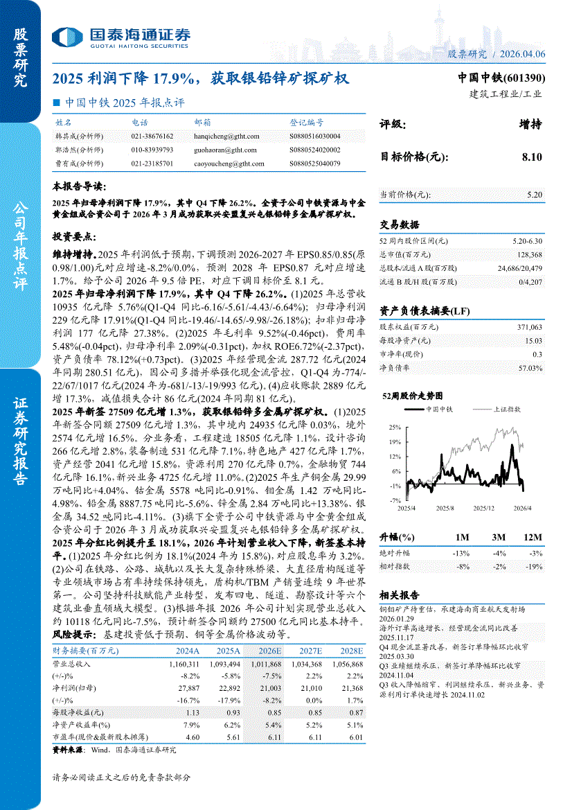 中国中铁:国泰海通证券-中国中铁-601390-2025年报点评:2025利润下降17.9%,获取银铅锌矿探矿权-260406