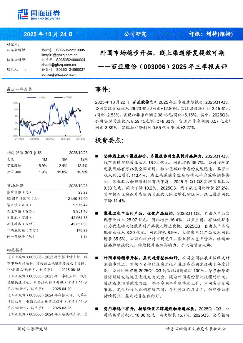 百亚股份:国海证券-百亚股份-003006-2025年三季报点评:外围市场稳步开拓,线上渠道修复提效可期-251024