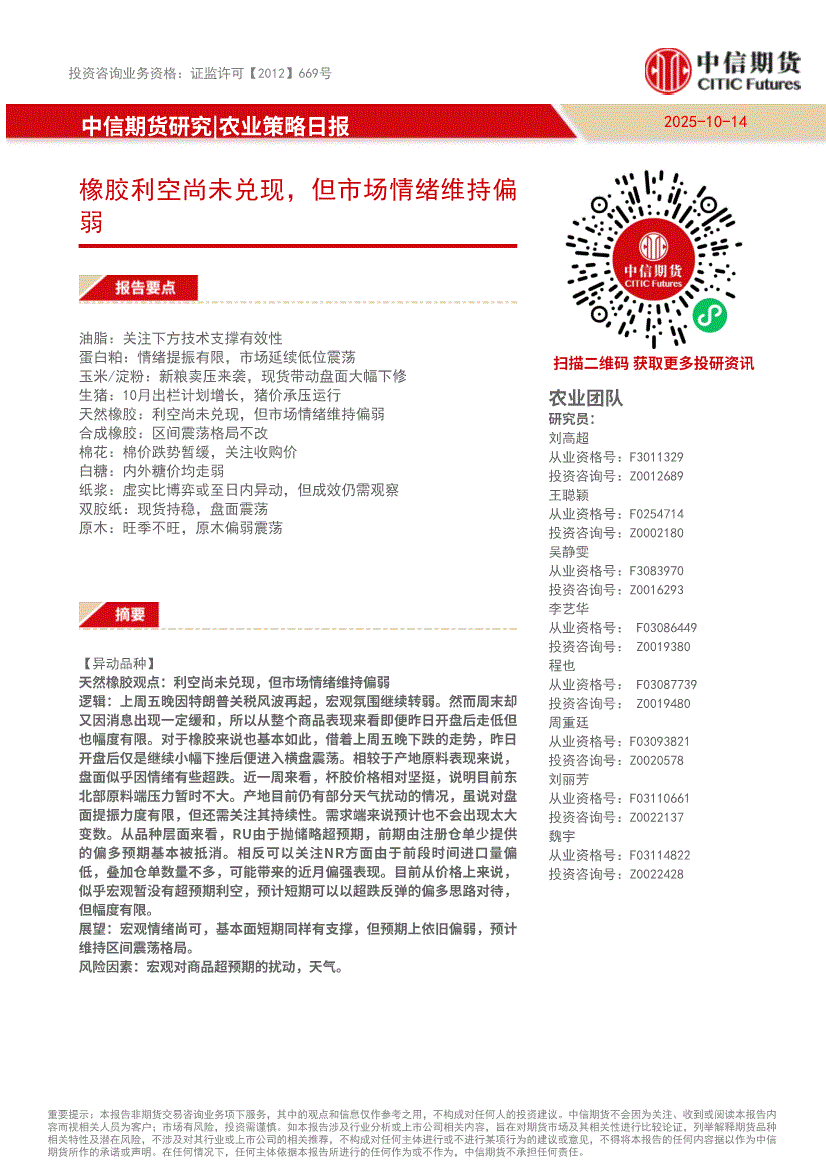 中信期货-农业策略日报:橡胶利空尚未兑现,但市场情绪维持偏弱-251014