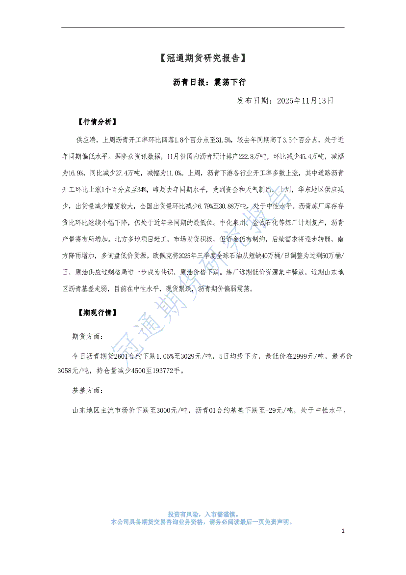 冠通期货-沥青日报:震荡下行-251113
