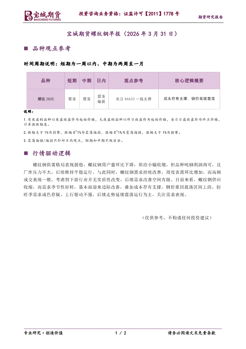 宝城期货-螺纹钢早报-260331