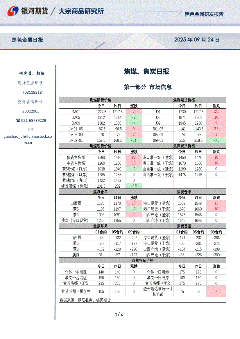 银河期货-焦煤、焦炭日报-250929