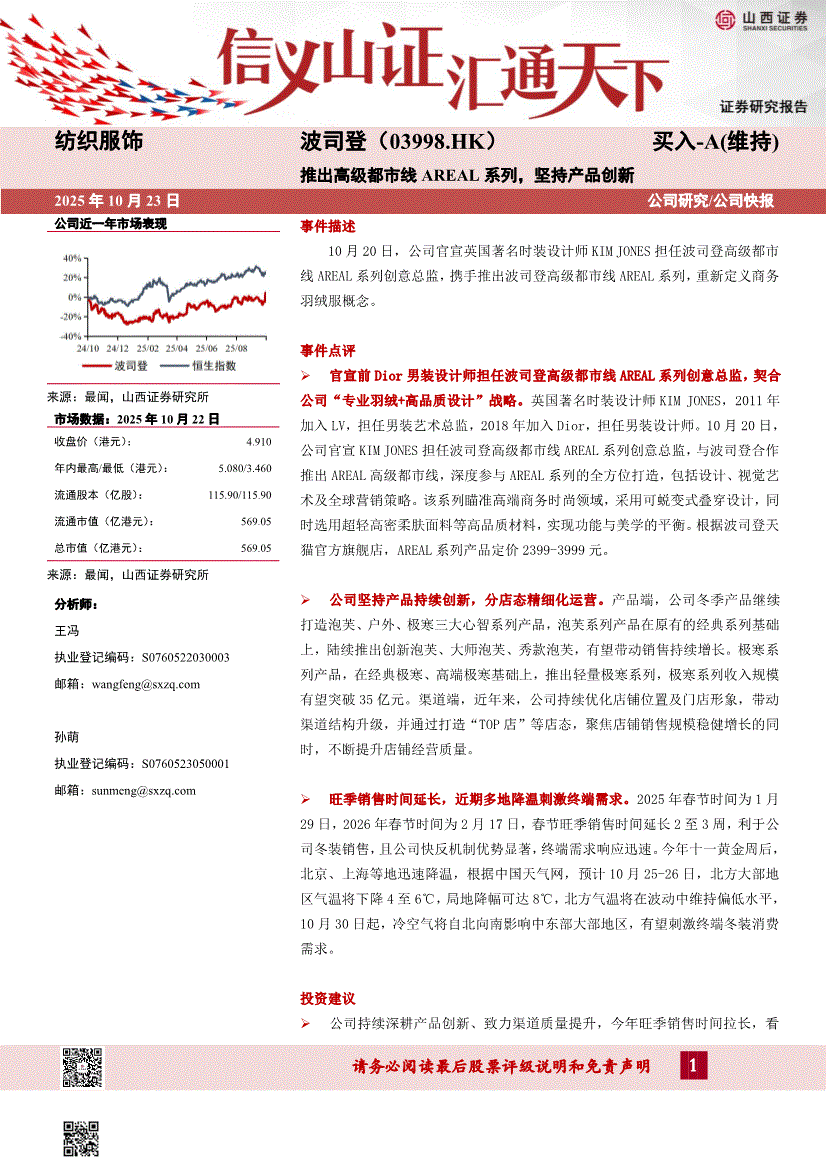 波司登:山西证券-波司登-3998.HK-推出高级都市线AREAL系列,坚持产品创新-251023