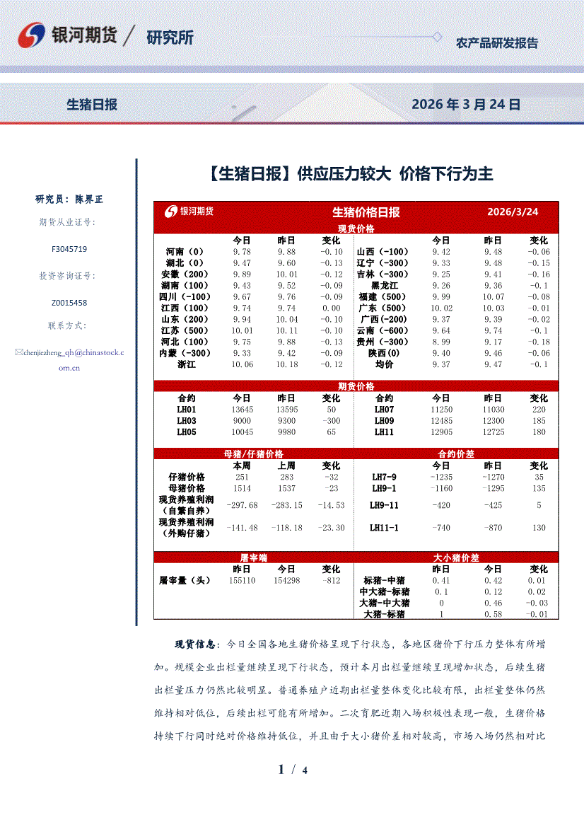 银河期货-生猪日报:供应压力较大,价格下行为主-260324