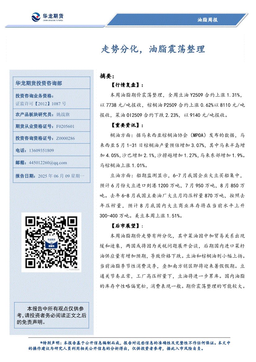 华龙期货-油脂周报:走势分化,油脂震荡整理-250609