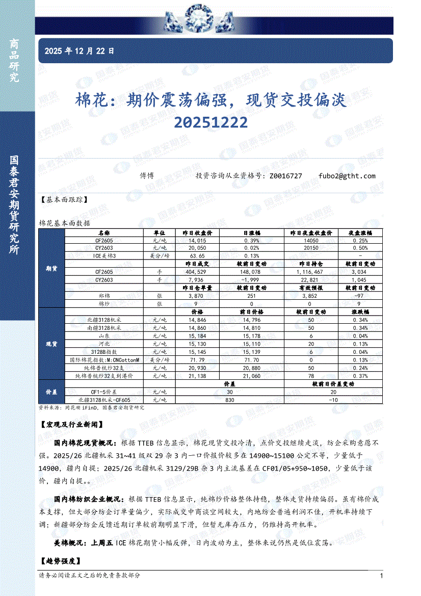 国泰君安期货-棉花:期价震荡偏强,注意整体市场情绪-251226