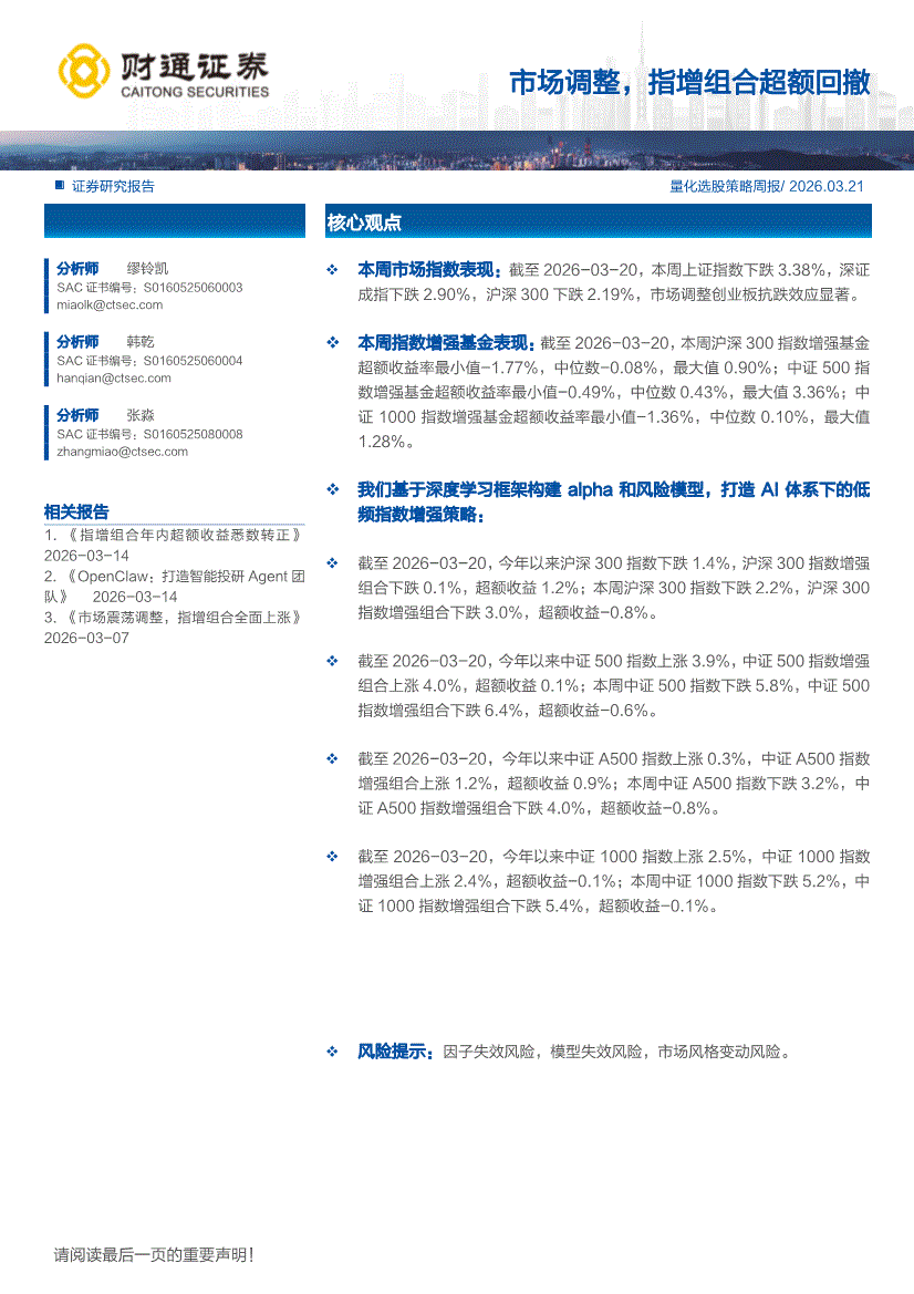 财通证券-量化选股策略周报:市场震荡调整,指增组合涨跌互现-260328