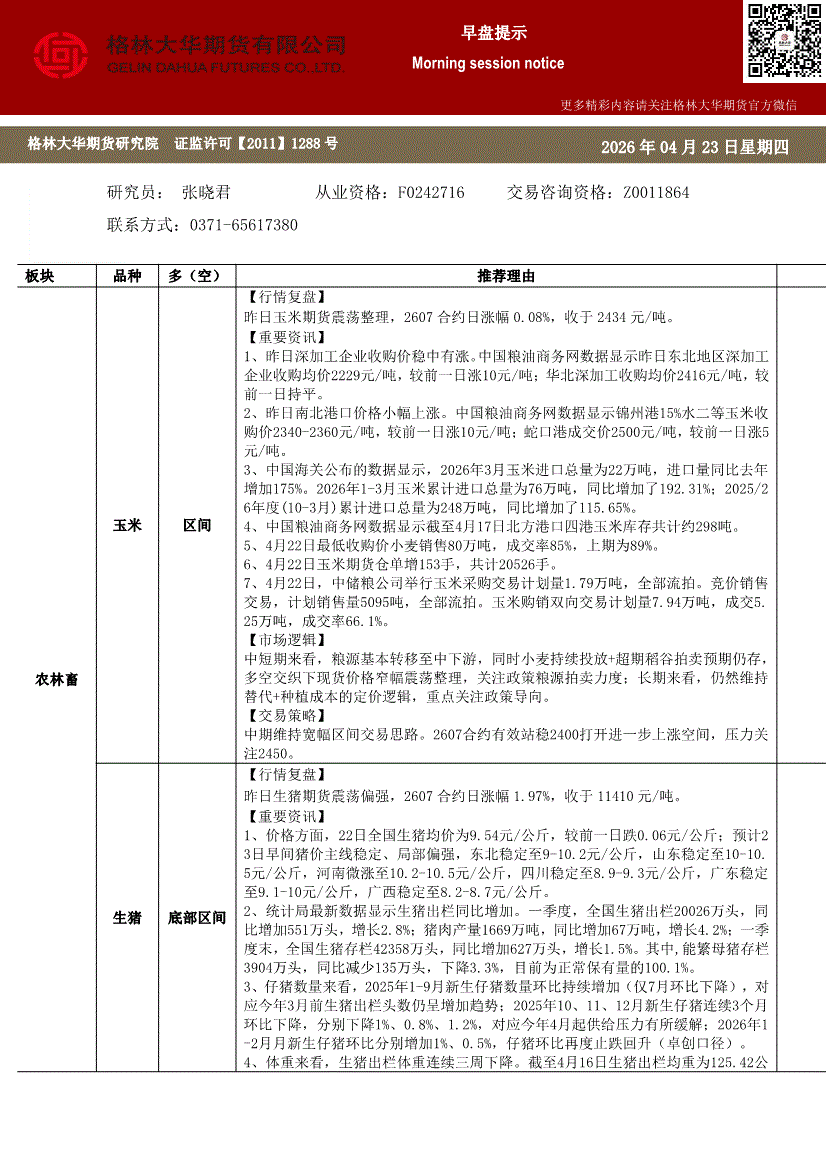 格林大华期货-早盘提示:玉米生猪鸡蛋-260423