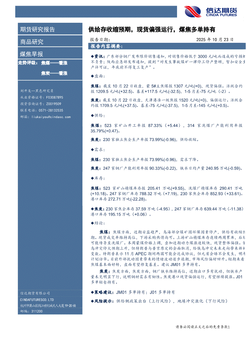 信达期货-煤焦早报:供给存收缩预期,现货偏强运行,煤焦多单持有-251023