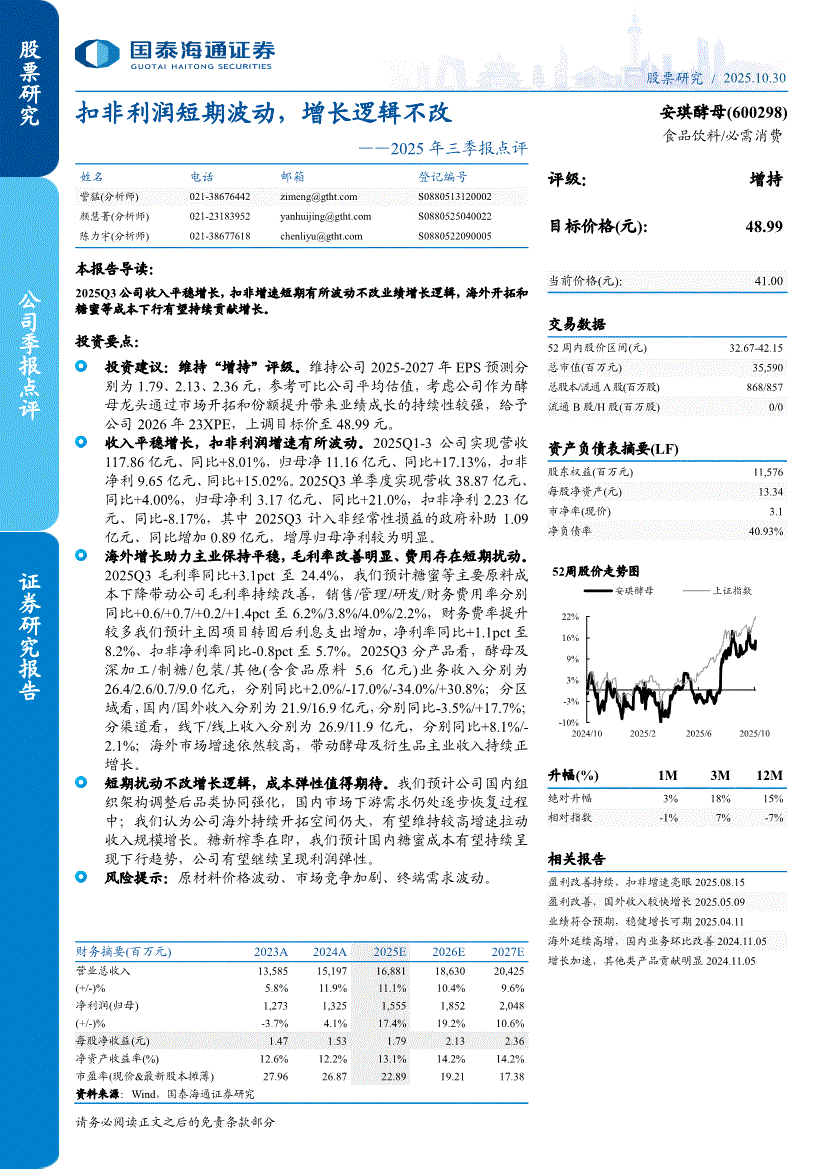安琪酵母:国泰海通证券-安琪酵母-600298-2025年三季报点评:扣非利润短期波动,增长逻辑不改-251030