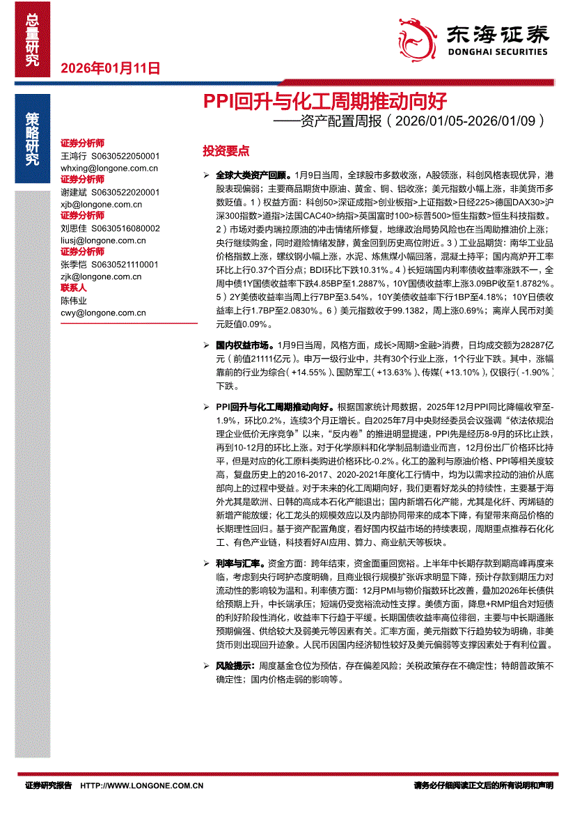 东海证券-资产配置周报:PPI回升与化工周期推动向好-260111
