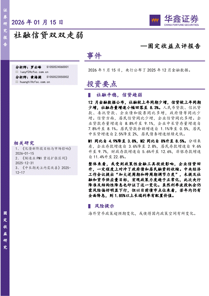 华鑫证券-固定收益点评报告:社融信贷双双走弱-260115