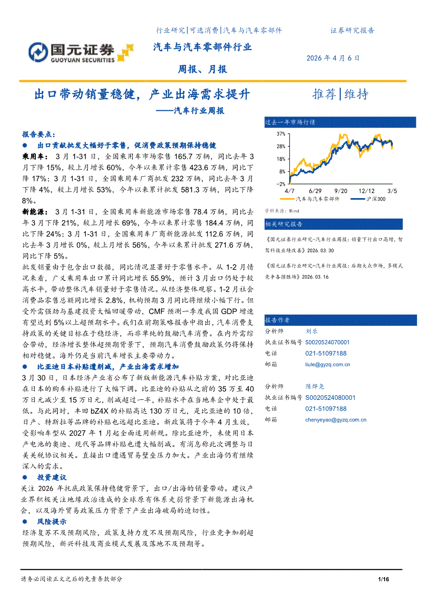 汽车行业:国元证券-汽车行业周报:出口带动销量稳健,产业出海需求提升-260406