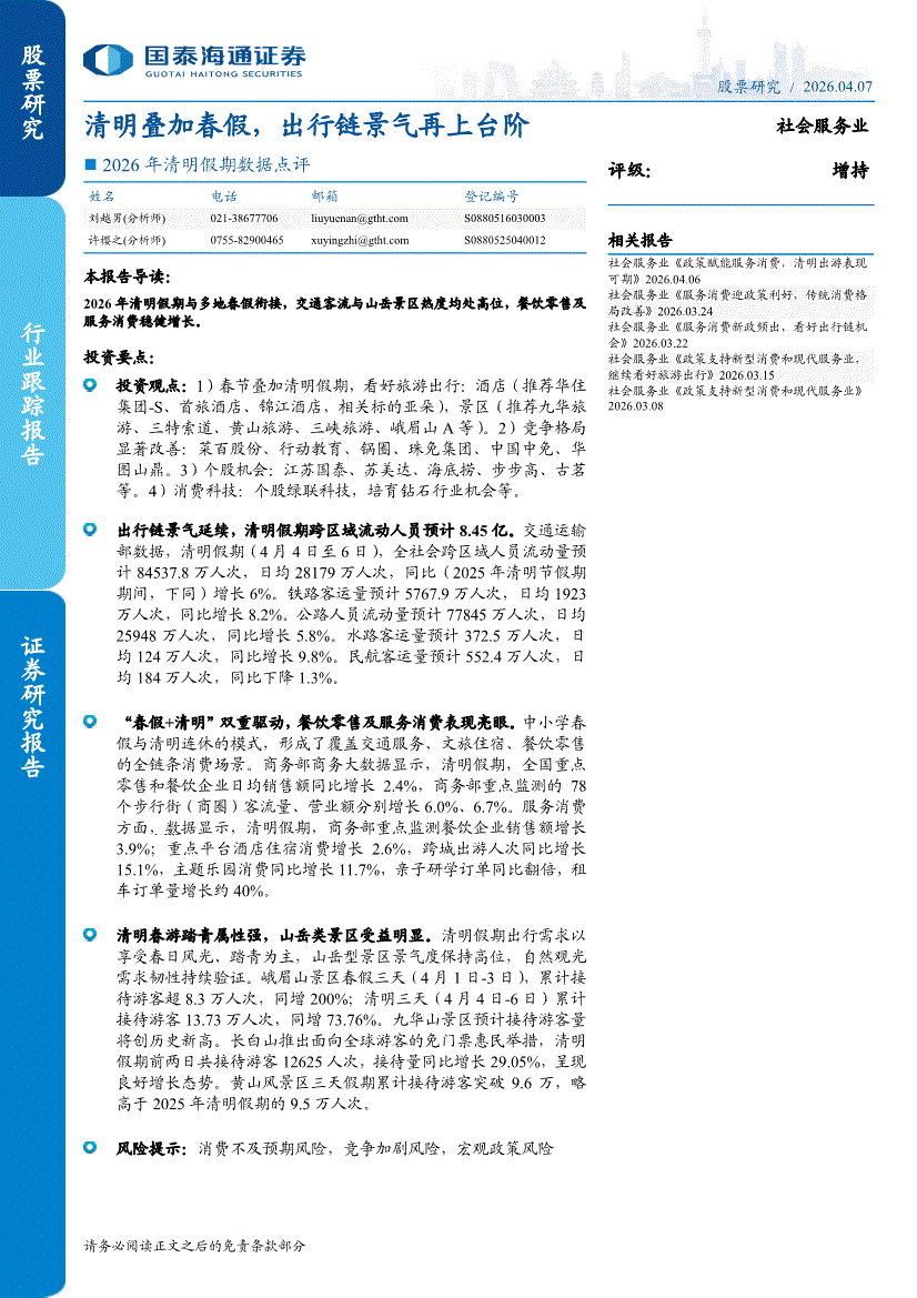 社会服务行业:国泰海通证券-社会服务行业2026年清明假期数据点评:清明叠加春假,出行链景气再上台阶-260407