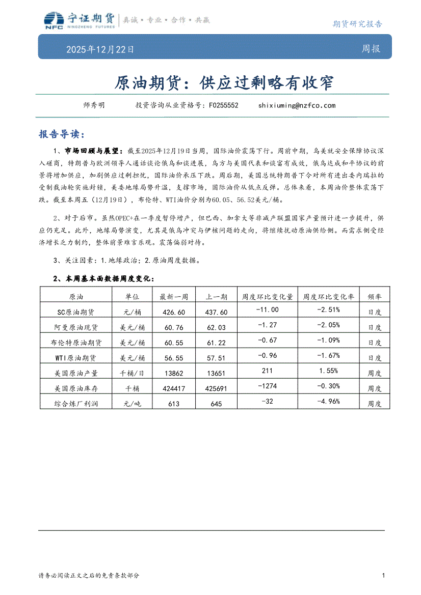 宁证期货-原油期货:供应过剩略有收窄-251222
