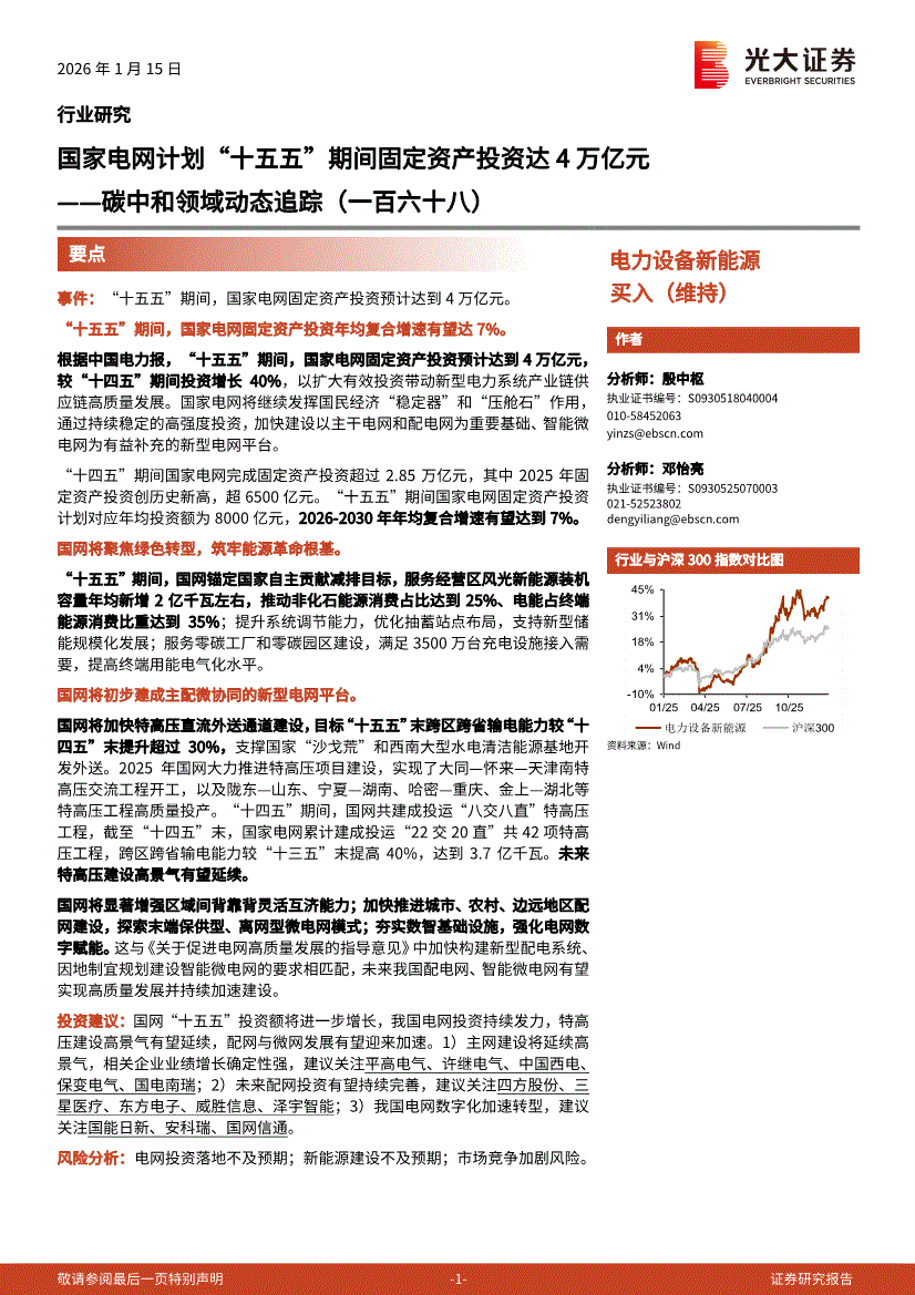 电力设备新能源行业:光大证券-电力设备新能源行业碳中和领域动态追踪(一百六十八):国家电网计划“十五五”期间固定资产投资达4万亿元-260115