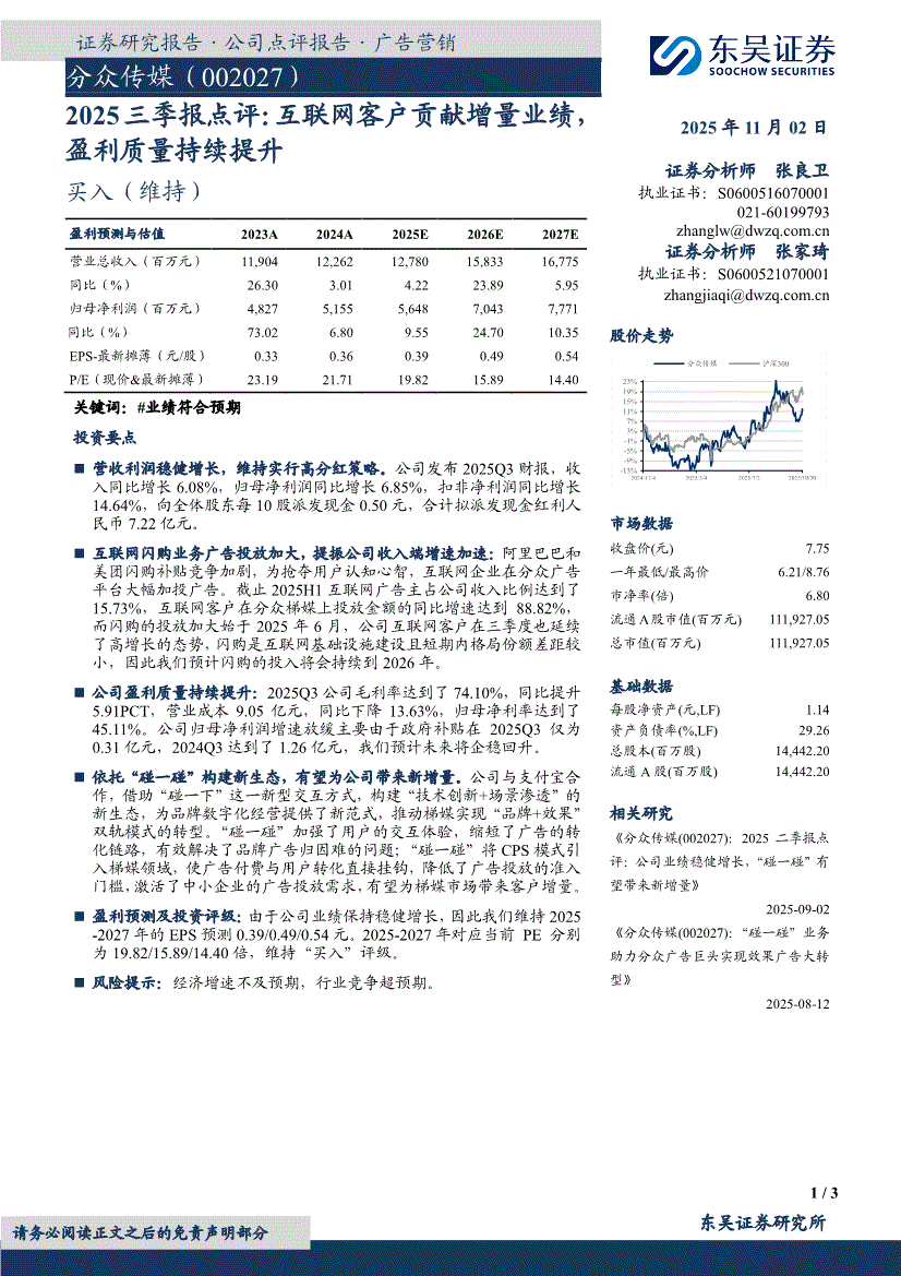 分众传媒:东吴证券-分众传媒-002027-2025三季报点评:互联网客户贡献增量业绩,盈利质量持续提升-251102