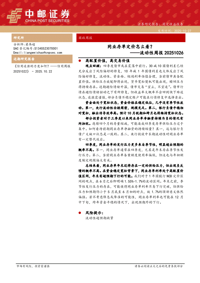 中邮证券-流动性周报:同业存单定价怎么看?-251027
