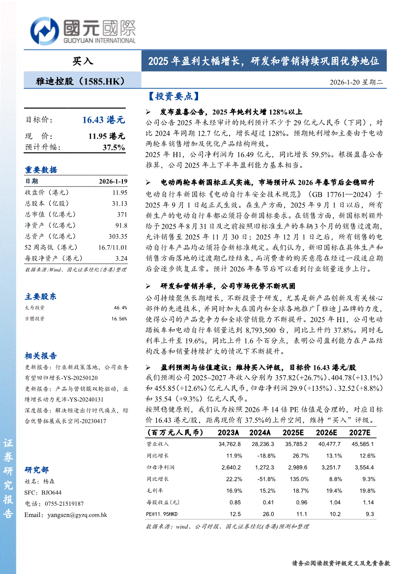 雅迪控股:国元国际-雅迪控股-1585.HK-2025年盈利大幅增长,研发和营销持续巩固优势地位-260120