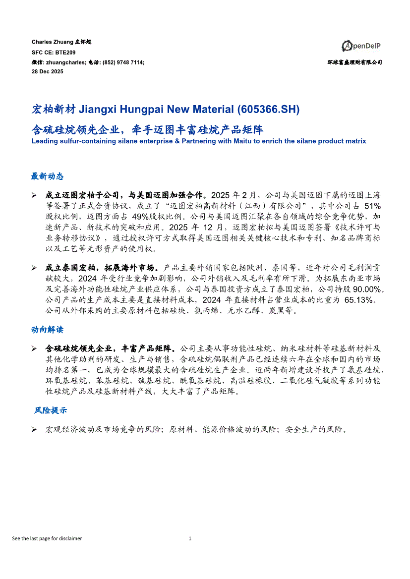 宏柏新材:环球富盛-宏柏新材-605366-含硫硅烷领先企业,牵手迈图丰富硅烷产品矩阵-251228