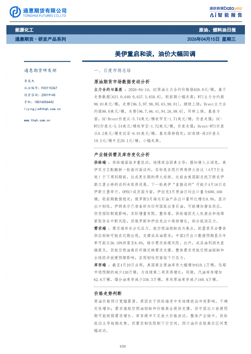 通惠期货-原油、燃料油日报:美伊重启和谈,油价大幅回调-260415