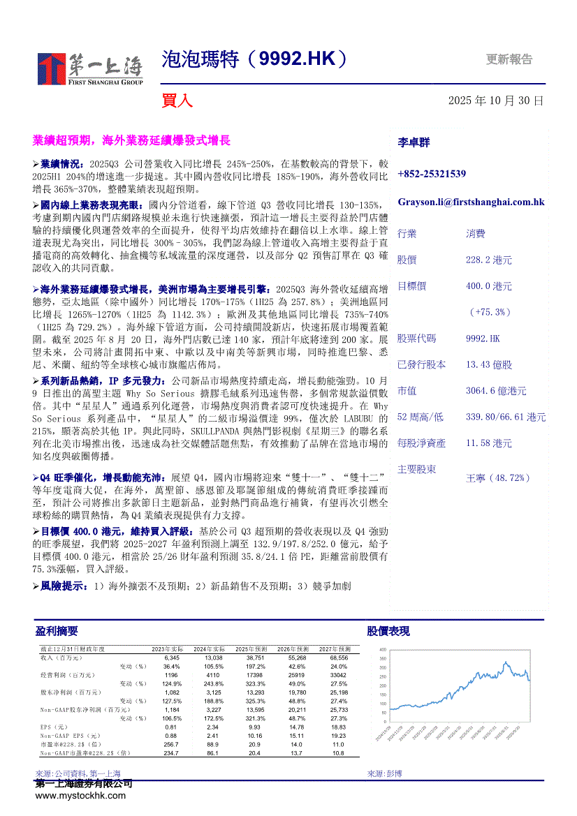 泡泡玛特:第一上海-泡泡玛特-9992.HK-业绩超预期,海外业务延续爆发式增长-251030