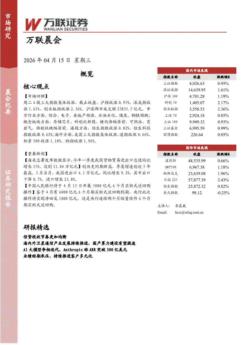 招商证券-全球产业趋势跟踪周报:海内外厂商密集发布新版模型,光通信行业景气度持续攀升-260413