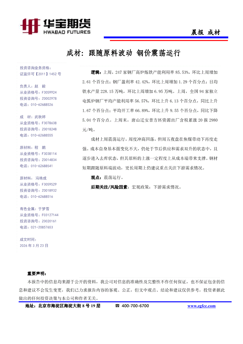 华宝期货-成材晨报:跟随原料波动,钢价震荡运行-260323