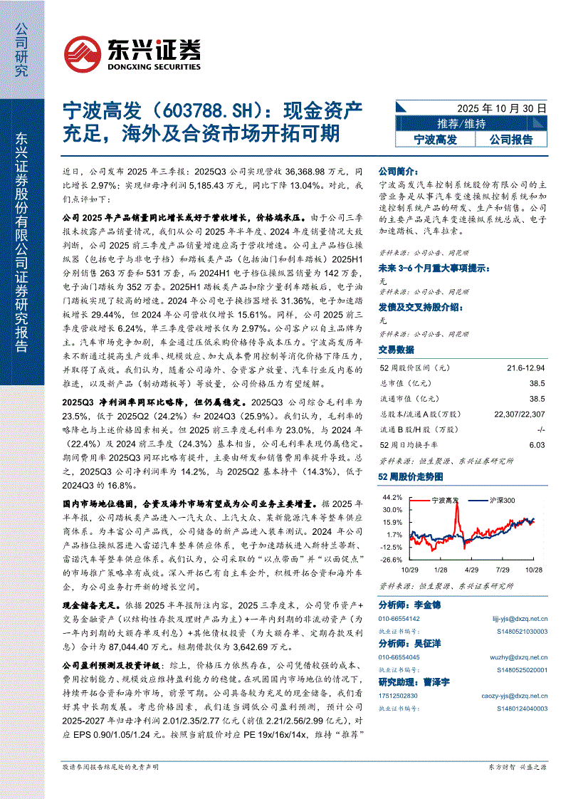 宁波高发:东兴证券-宁波高发-603788-现金资产充足,海外及合资市场开拓可期-251030