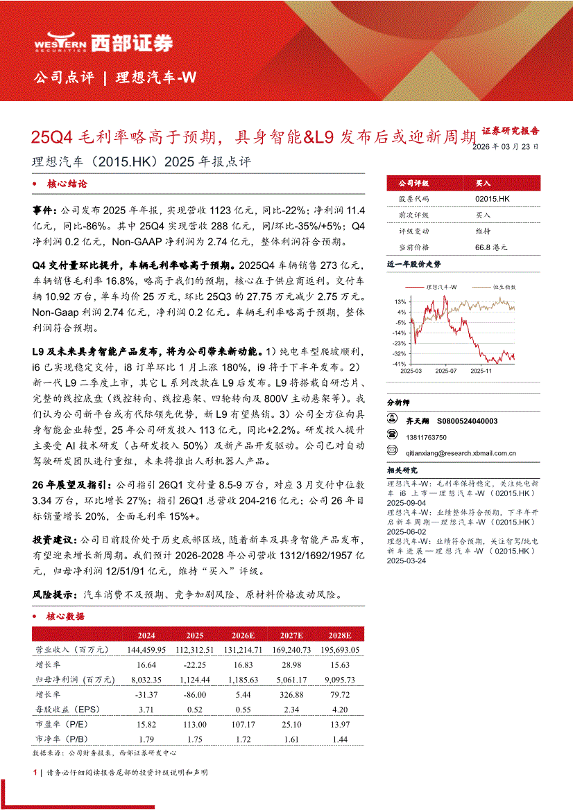 理想汽车:西部证券-理想汽车-2015.HK-2025年报点评:25Q4毛利率略高于预期,具身智能&L9发布后或迎新周期-260323