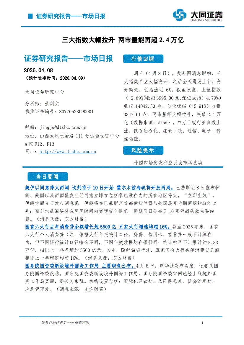 大同证券-市场日报:三大指数大幅拉升,两市量能再超2.4万亿-260408