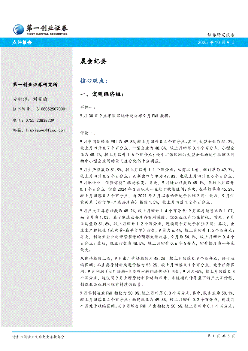 第一创业-晨会纪要-251009