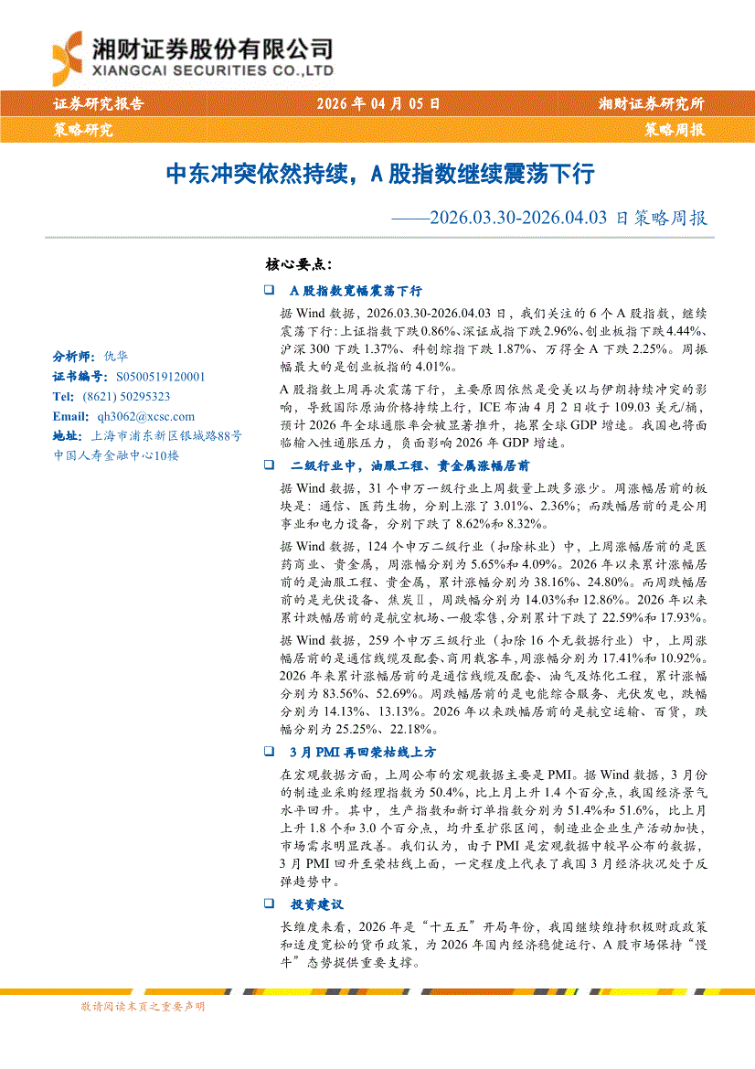 湘财证券-2026.03.30~2026.04.03日策略周报:中东冲突依然持续,A股指数继续震荡下行-260405