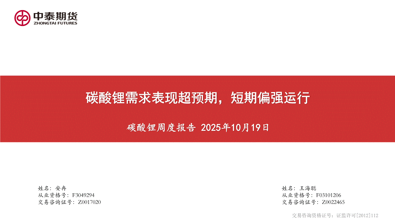 中泰期货-碳酸锂周度报告:碳酸锂需求表现超预期,短期偏强运行-251019