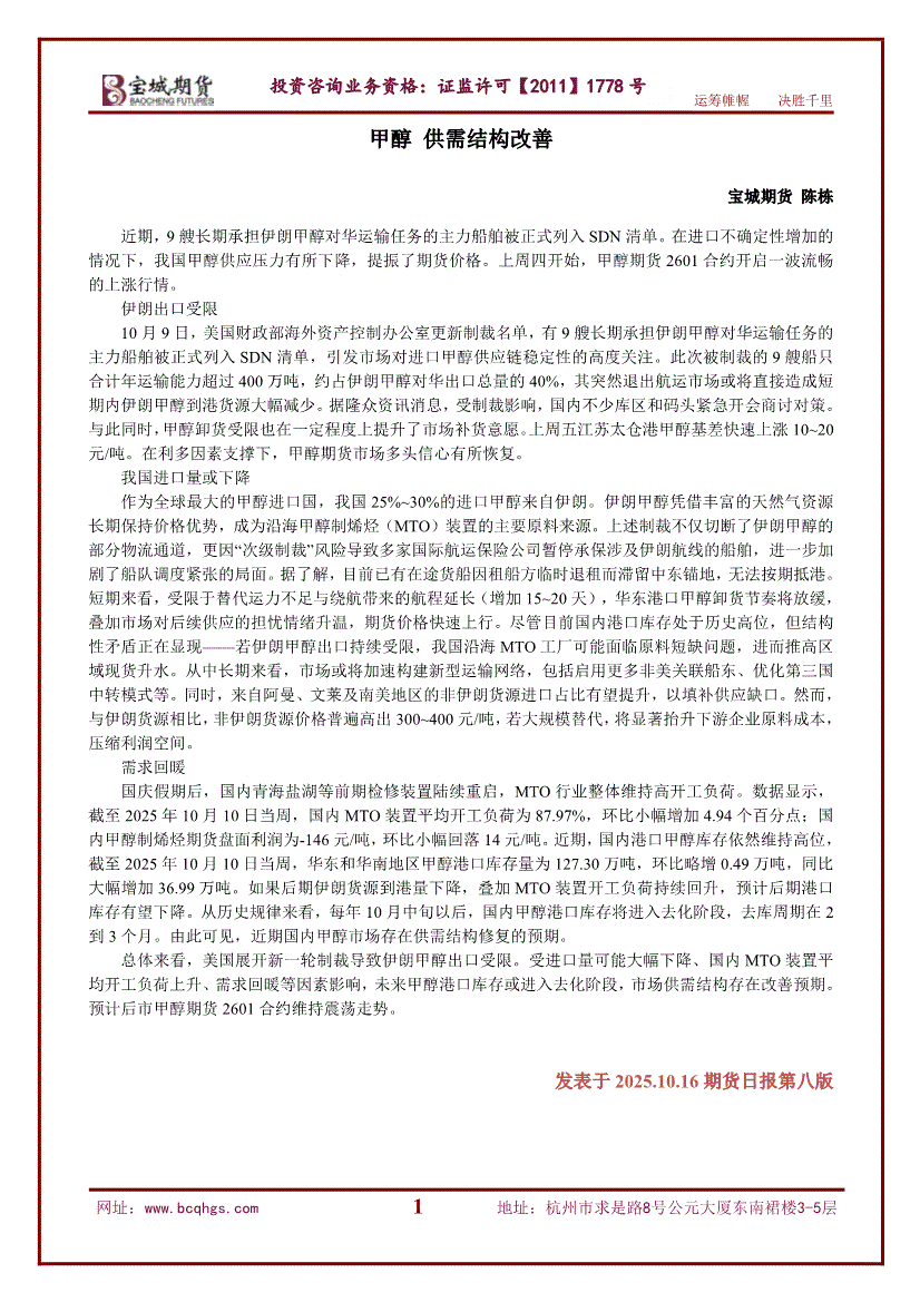 宝城期货-甲醇:供需结构改善-251016