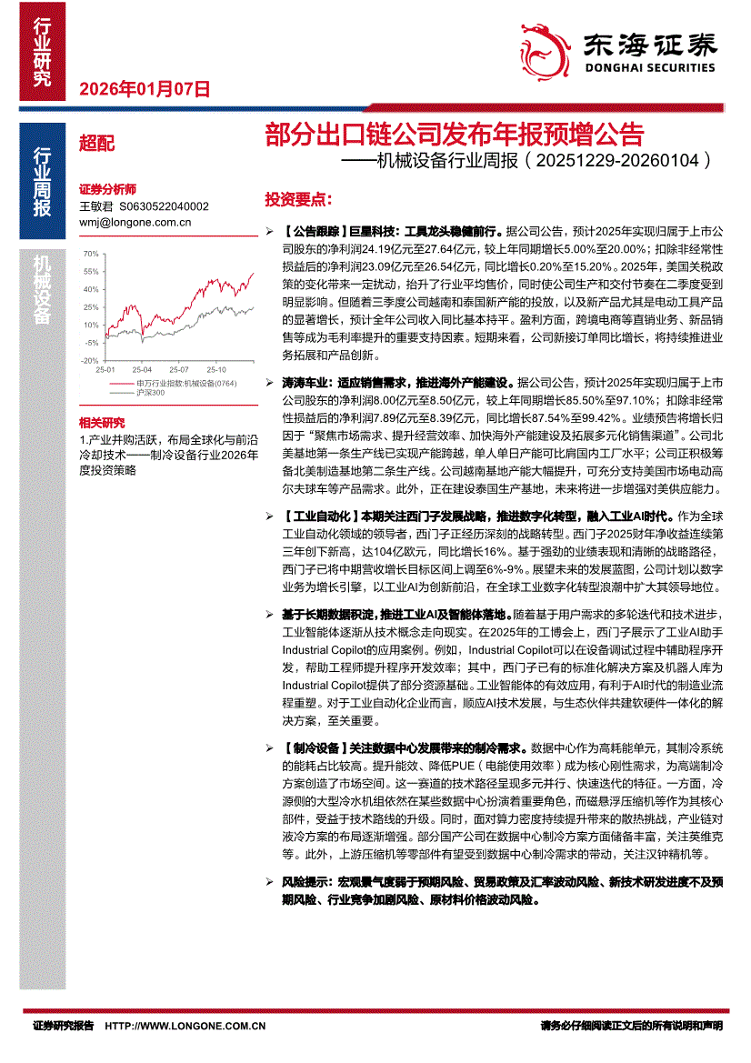 机械设备行业:东海证券-机械设备行业周报:部分出口链公司发布年报预增公告-260107