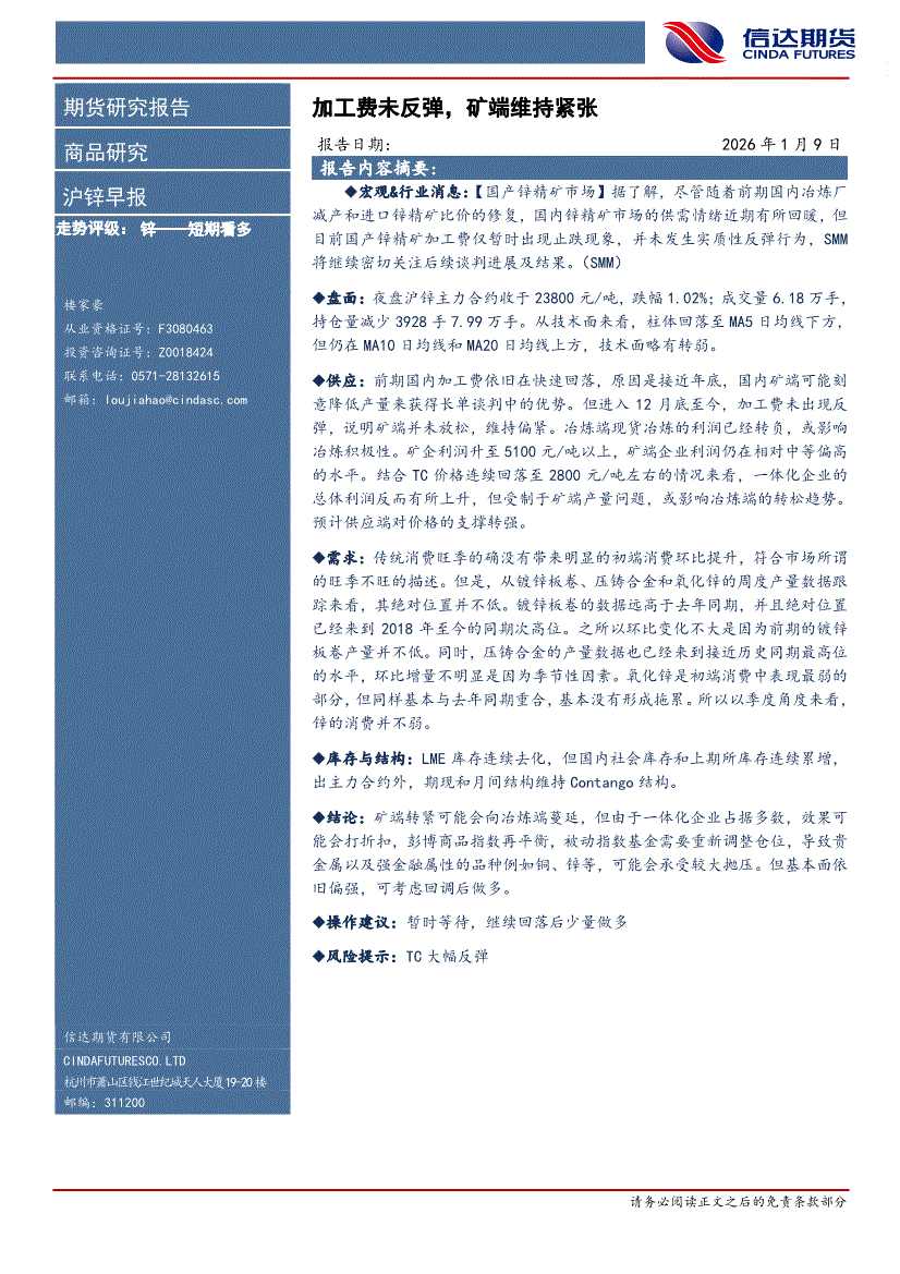 信达期货-沪锌早报:加工费未反弹,矿端维持紧张-260109