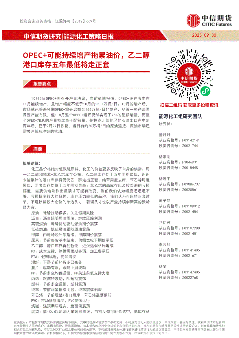 中信期货-能源化工策略日报:OPEC+可能持续增产拖累油价,乙二醇港口库存五年最低将走正套-250930