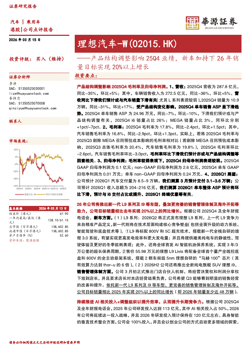 理想汽车~W:华源证券-理想汽车~W-2015.HK-产品结构调整影响25Q4业绩,新车加持下26年销量目标实现20%以上增长-260315