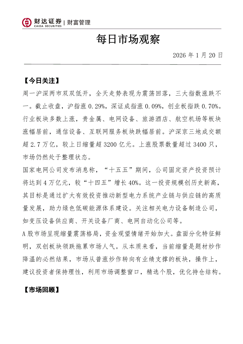 财达证券-每日市场观察-260120
