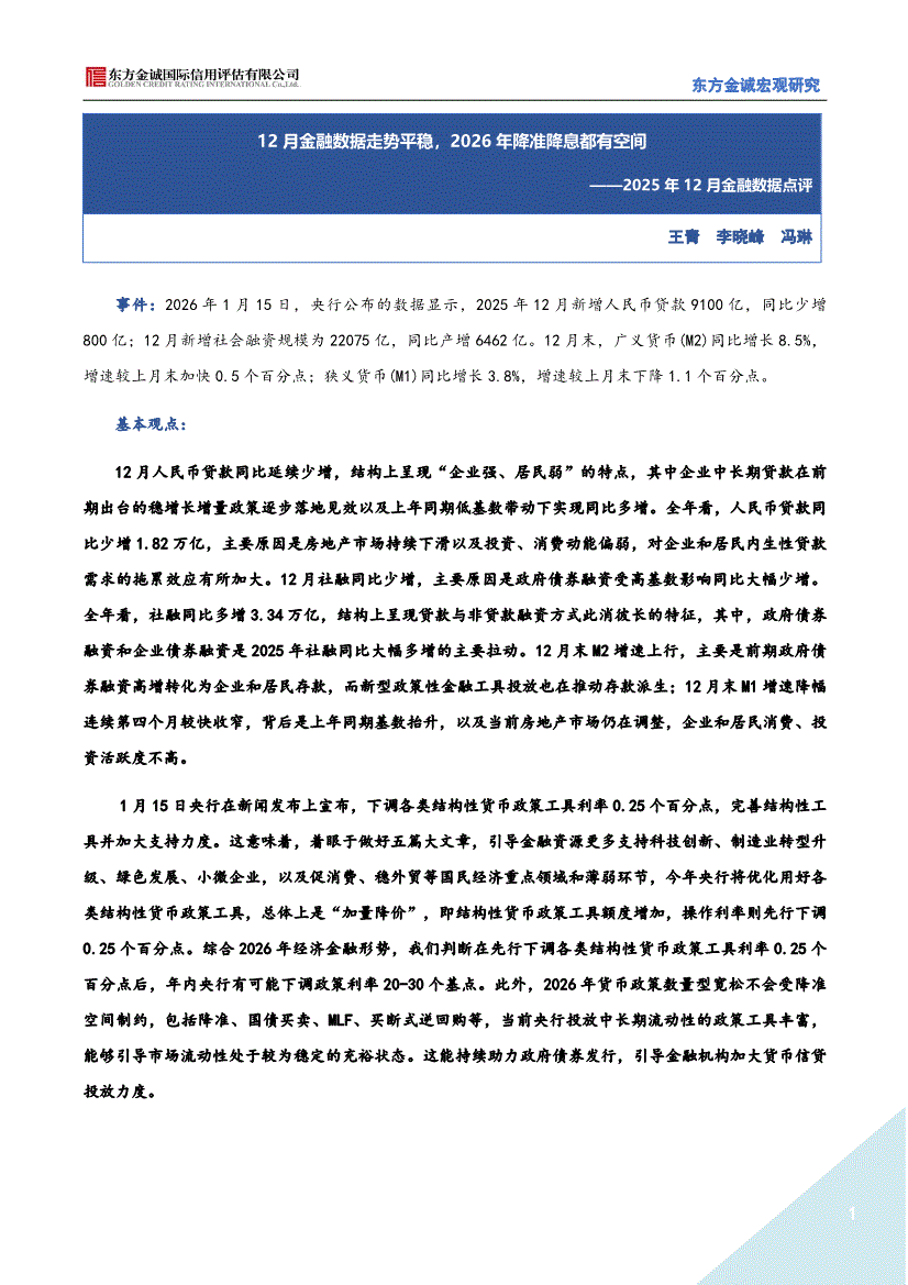 东方金诚-2025年12月金融数据点评:12月金融数据走势平稳,2026年降准降息都有空间-260119