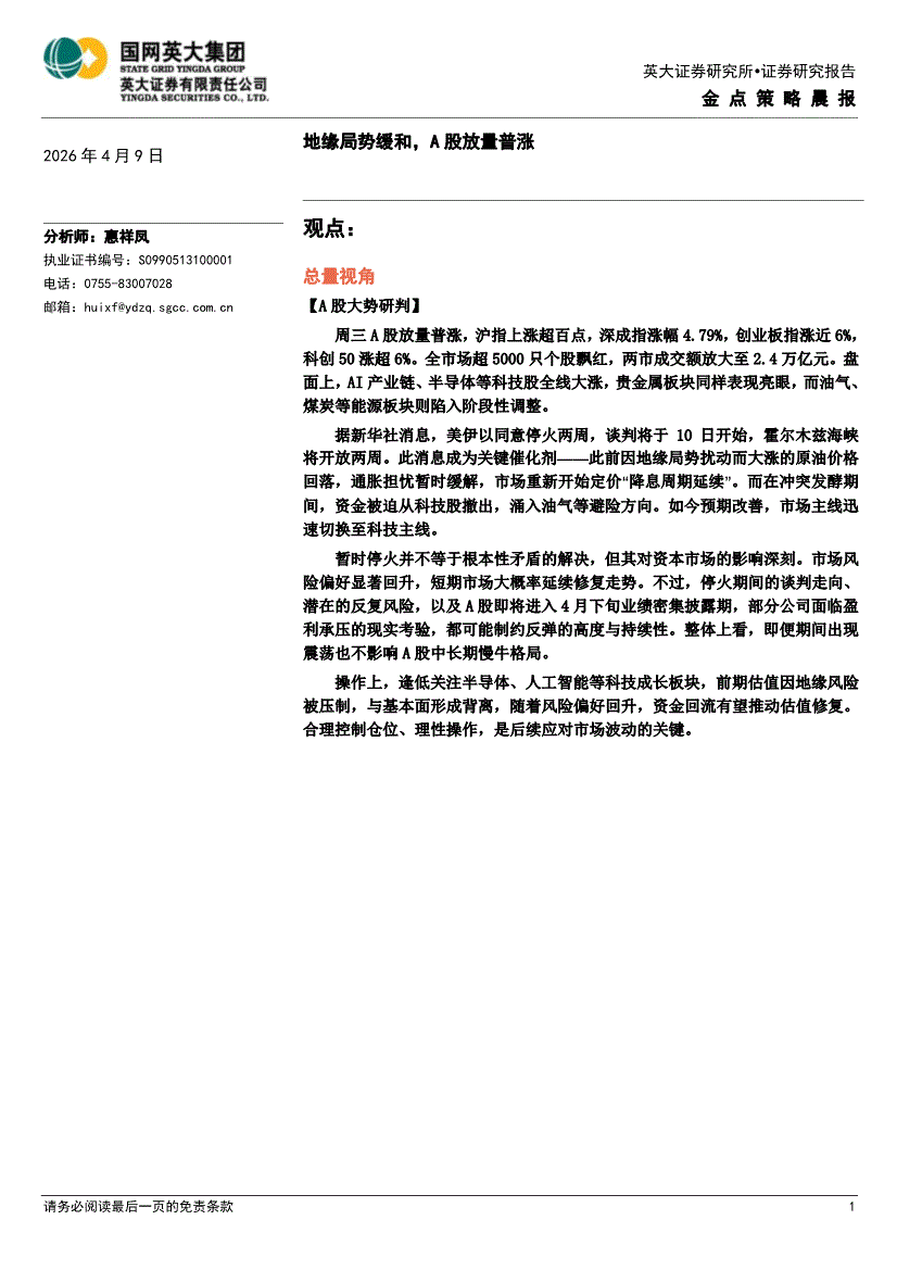 英大证券-金点策略晨报:地缘局势缓和,A股放量普涨-260409