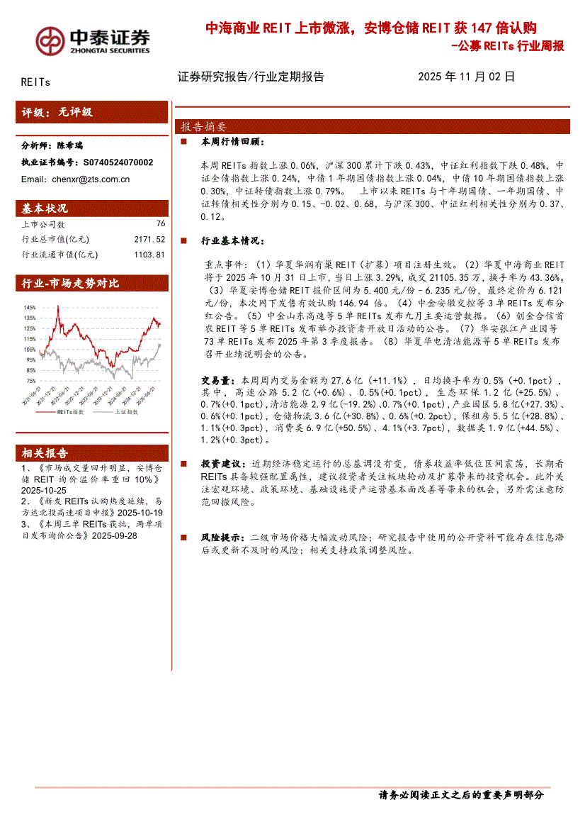 REITs行业:中泰证券-公募REITs行业周报:中海商业REIT上市微涨,安博仓储REIT获147倍认购-251102