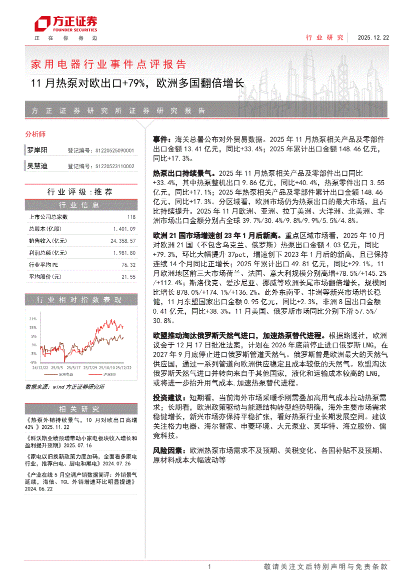 家用电器行业:方正证券-家用电器行业事件点评报告:11月热泵对欧出口+79%,欧洲多国翻倍增长-251222