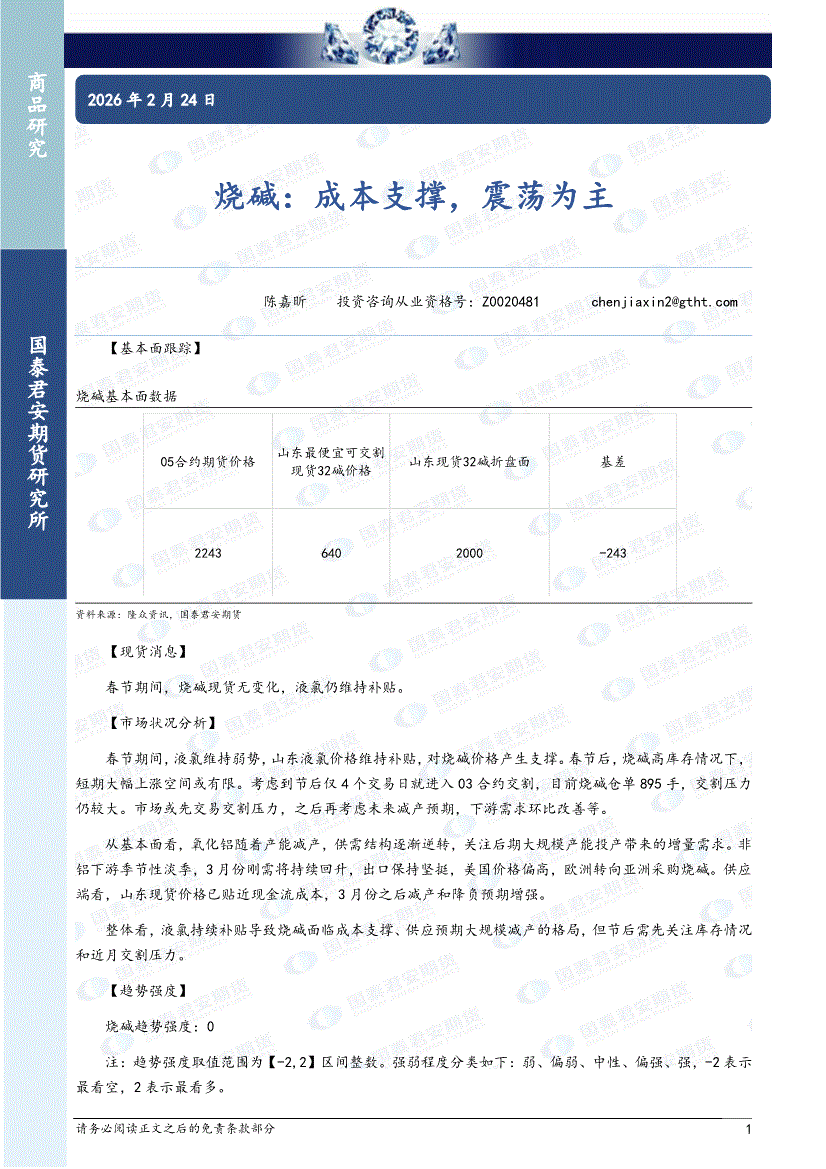 国泰君安期货-烧碱:成本支撑,震荡为主-260224