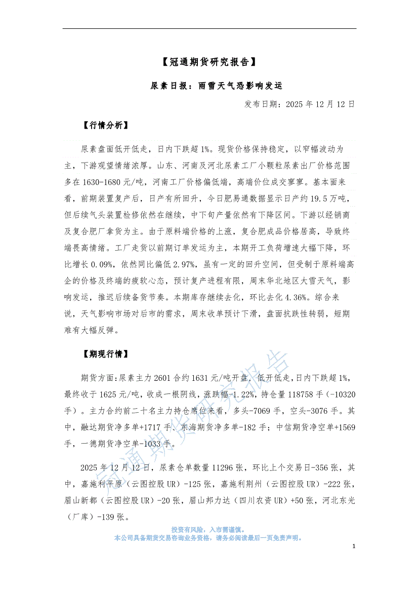 冠通期货-尿素日报:雨雪天气恐影响发运-251212