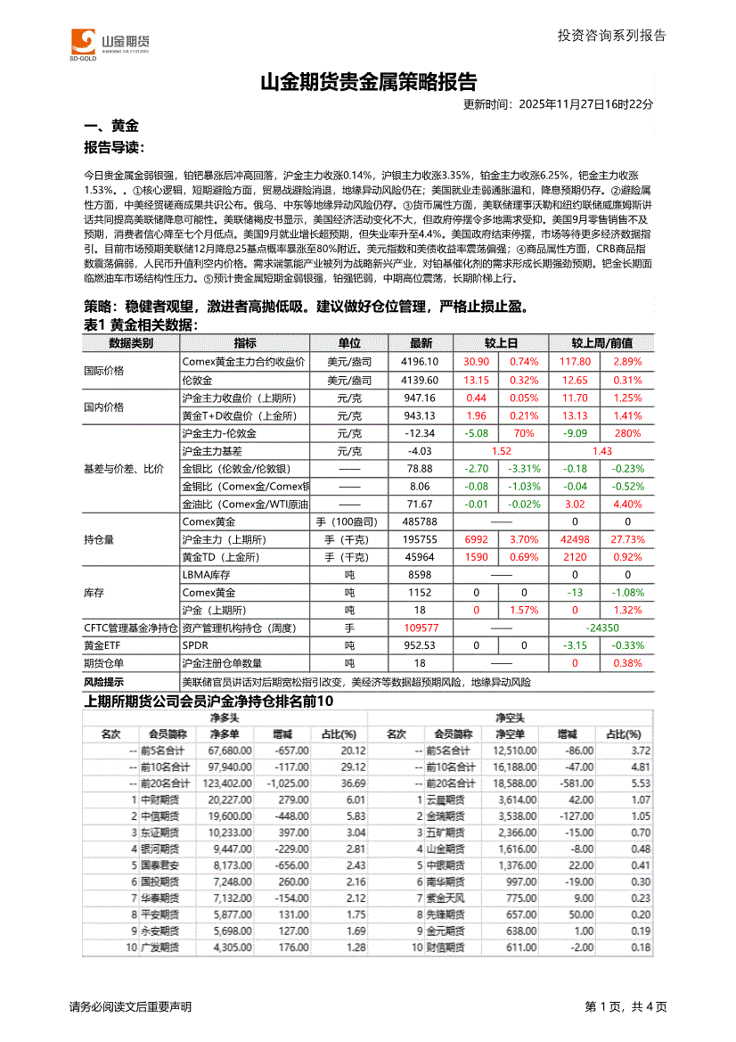 山金期货-贵金属月度策略报告:12月降息预期持续发酵,金银铂钯高位分化-251202