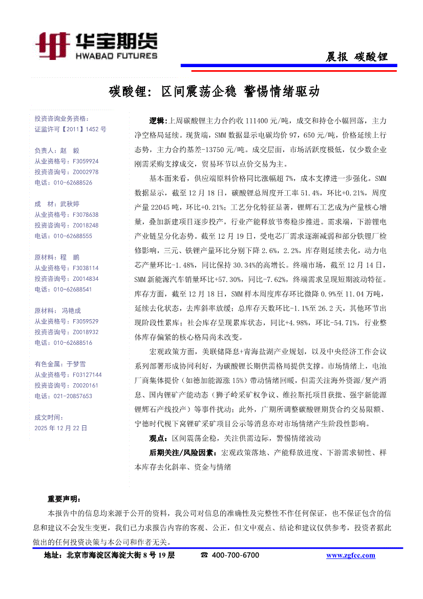 华宝期货-碳酸锂晨报:区间震荡企稳,警惕情绪驱动成材,重心下移偏弱运行-251222