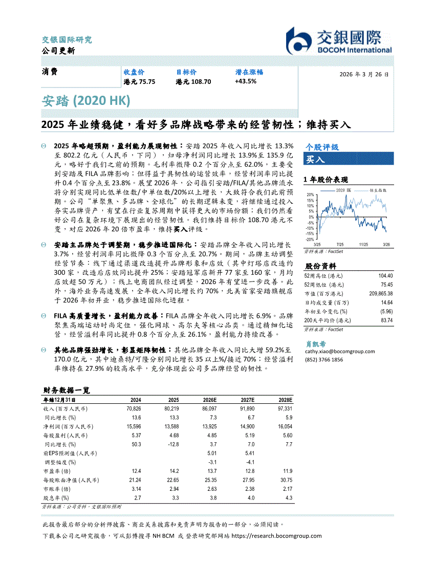 安踏:交银国际-安踏-2020.HK-2025年业绩稳健,看好多品牌战略带来的经营韧性;维持买入-260326