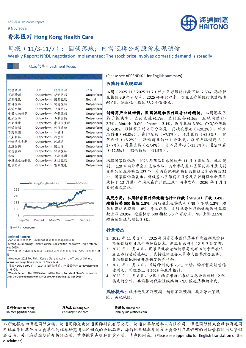 医疗行业:海通国际-香港医疗行业周报:国谈落地,内需逻辑公司股价表现稳健-251109